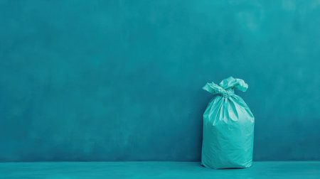 A single teal garbage bag stands against a smooth matching wall, showcasing a clean and minimalist aesthetic perfect for modern indoor environments and spaces.