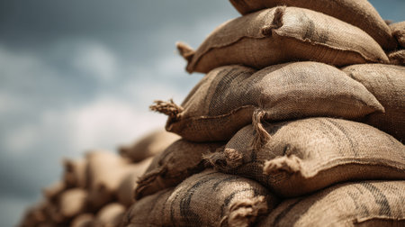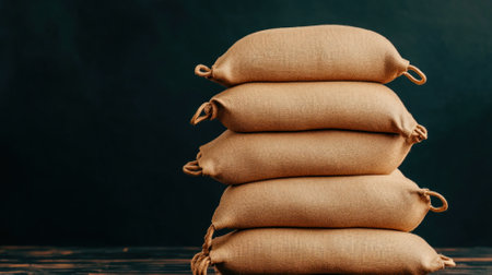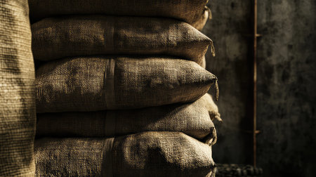 This captivating image showcases neatly stacked burlap bags with rich textures and earthy tones. Perfect for representing agriculture, crafts, or rustic decor.