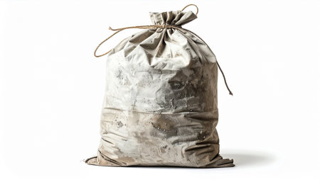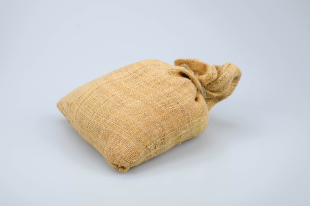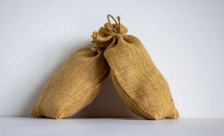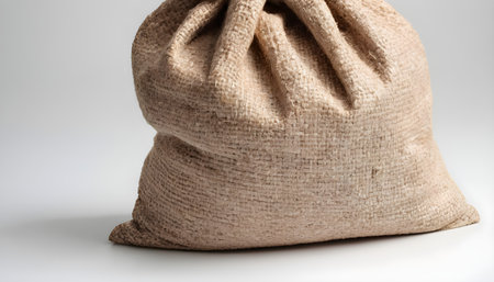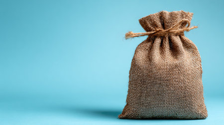 This image features a close-up of a tied jute sack made from natural fibers, showcasing its textured fabric and rustic charm against a bright background.