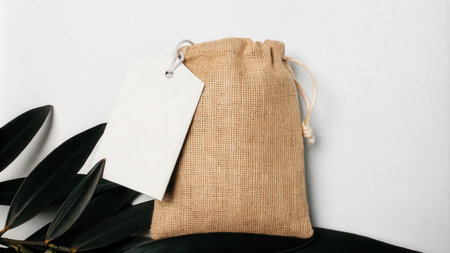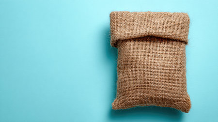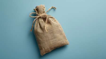 Eco-friendly packaging made of burlap cloth rests on a clean sky-blue background, highlighting sustainable practices in modern product packaging design
