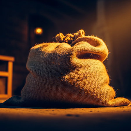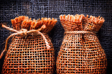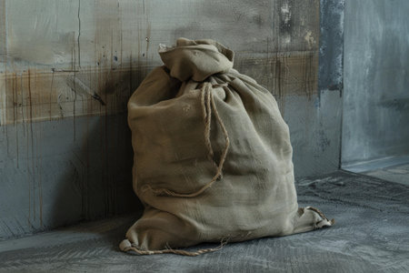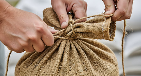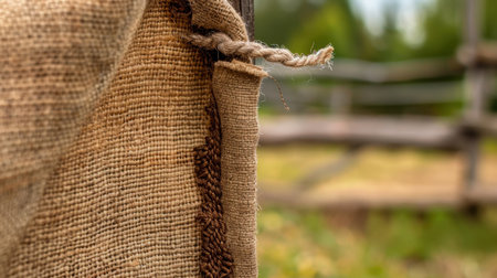 A close-up of a rustic burlap sack tied with twine, showcasing its textured surface and earthy tones, ideal for backgrounds and creative uses.