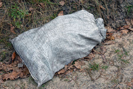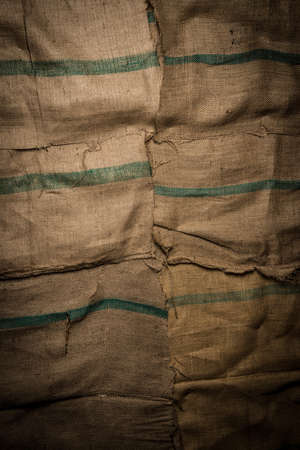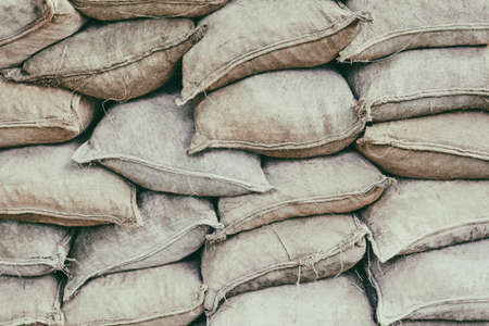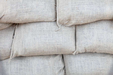 Background of lying on top of each other gray sandbags. Bags to strengthen the defensive structure during the battle. Sand bag flood protection wall texture, texture.