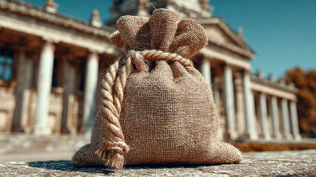 Symbolic image of a burlap sack tied with rope placed in front of a classical government building, representing finance, wealth, or taxation.