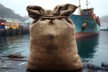 A rustic burlap sack stands prominently on a weathered dock, set against a backdrop of a bustling harbor. a large cargo ship, filled with colorful shipping containers, looms in the background, suggesting themes of industry and global trade. Generative AI