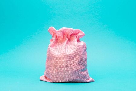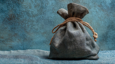 A charming rustic fabric bag tied with jute twine rests on a textured blue background, ideal for various creative and decorative uses.