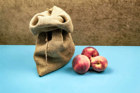 A rustic burlap sack sits elegantly on a wooden surface against a striking blue background. Ideal for projects emphasizing simplicity and rustic charm.