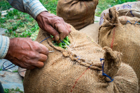 Hands sewing packed bags filled with freshly harvested organic green peas to be transported to the vegetable market. Uttarakhand India.