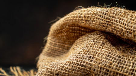 This close-up photograph showcases a textured brown burlap fabric, highlighting the natural fibers and warm tones against a dark background. Ideal for rustic-themed projects.