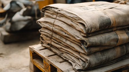 Close-up of cement bags stacked on a wooden pallet with dust around the edges