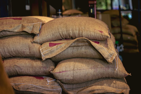Stacked Burlap Bags of Coffee Beans in a Warehouse