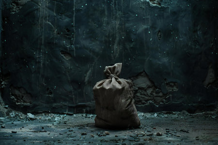 Closed burlap sack stands against a vintage wooden wall, evoking a sense of mystery