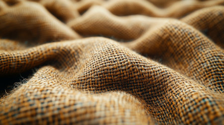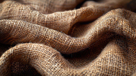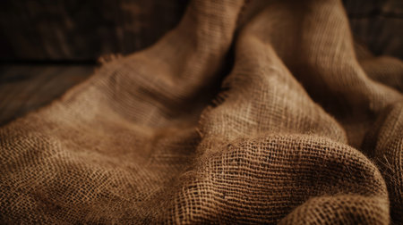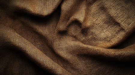 This close-up photograph showcases a textured brown burlap fabric, highlighting the natural fibers and warm tones against a dark background. Ideal for rustic-themed projects.