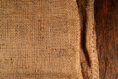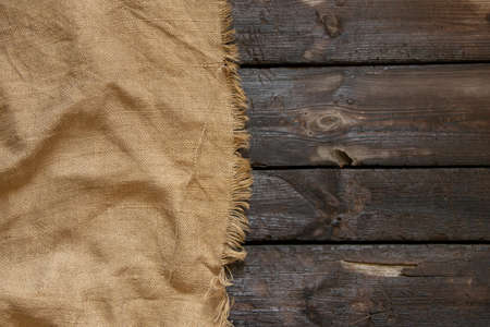 Natural sackcloth on brown wooden background. Canvas on brown table