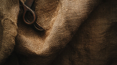This captivating image features a rustic brown fabric complemented by vintage scissors, showcasing intricate texture and elements of craftsmanship. Perfect for design and inspiration.