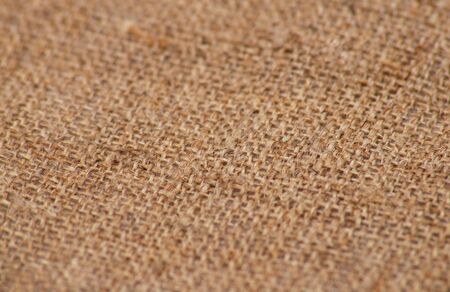 Close up view on brown burlap fabric. Crumpled sackcloth, abstract background. Texture of brown baline. Selective soft focus. Blurred background