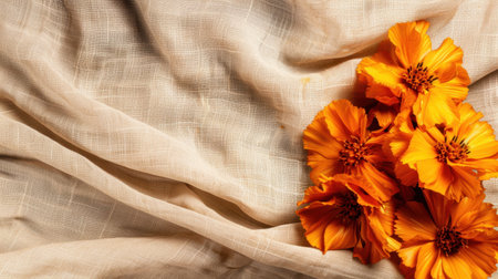Bright orange flowers are arranged on soft, textured fabric, creating warm and inviting atmosphere. delicate folds of fabric complement vibrant blooms beautifully