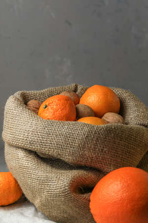 Ripe, tasty and juicy oranges, tangerines in a canvas bag with walnuts on the table.