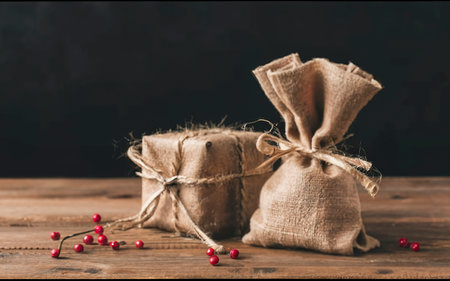 Romantic table setting with eco-friendly linen packaging gift with wooden heart decoration.