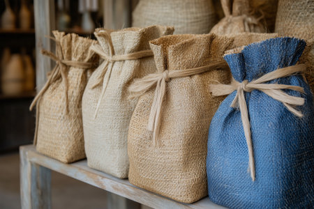 Burlap sacks displayed on a wooden shelf in a rustic shop