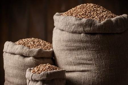 Grain of the wheat in bags on a wooden plank floor
