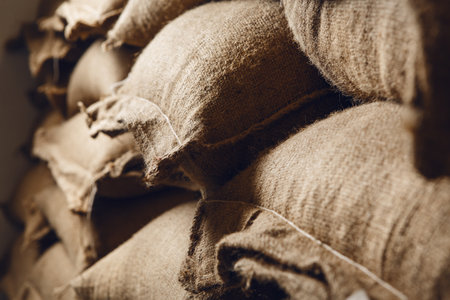 multiple coffee sacks stacked in a factory, created with generative ai