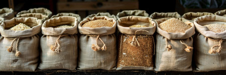 Bags of grain stacked in a storage area, creating a rustic atmosphere, earthy tones creating a warm, agricultural feel, ideal for farming or food industry concepts