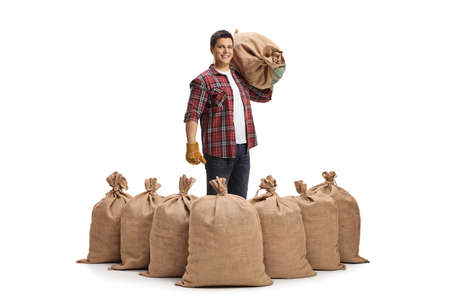 Full length portrait of a farmer with a pile of sacks and one sack over his shoulder isolated on white background