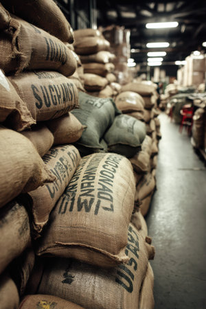 Burlap sacks filled with coffee beans sit stacked, showcasing country of origin stamps in a bustling warehouse setting. the distribution center is illuminated with fluorescent lights, emphasizing the organized network of global trade and export.