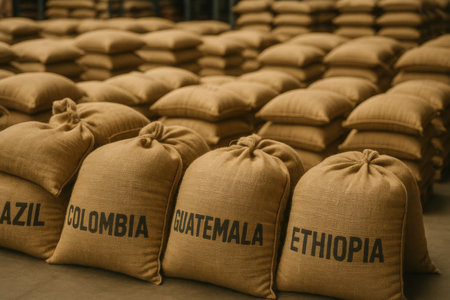 Burlap sacks filled with coffee beans from Brazil, Colombia, Guatemala, and Ethiopia are neatly stacked in a warehouse, showcasing global coffee distribution and trade.