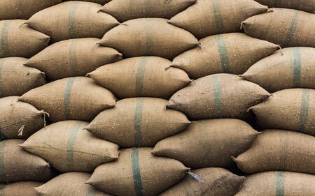 Old hemp sacks containing rice placed stacked