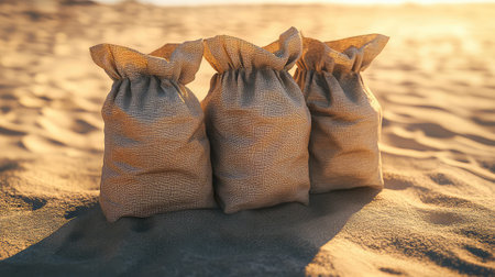 Sandbags are arranged in a pyramid configuration, creating a strong visual focus with a softly blurred background that enhances the overall atmosphere.