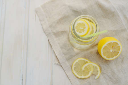 Lemonade with lemon slices in a jar with straw on a white wooden background