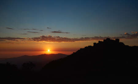 A medieval castle on the top of a hill with tree silhouettes and a clear sky with copy space covadonga