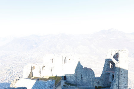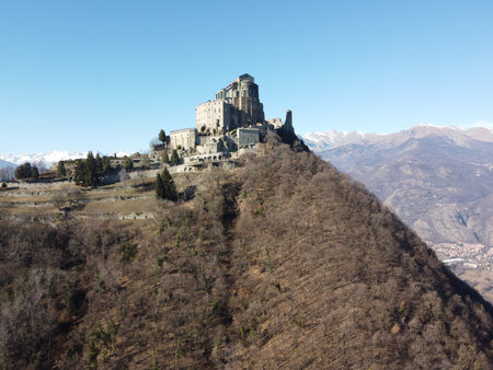 Exterior long distant view of san michele sacra abbey located at top of pichiriano mountain in piamonte district, Italy