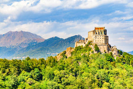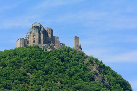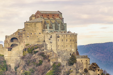 Sacra di San Michele church seen from a hill near her,the church is located atop a rocky crag base and towers above the valley.It is located near Turin Italy