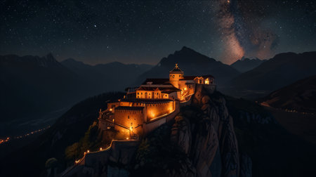 A majestic castle sits atop a rocky hill, surrounded by lush greenery. The sunset casts a warm glow over the mountains, highlighting the serene valley below.
