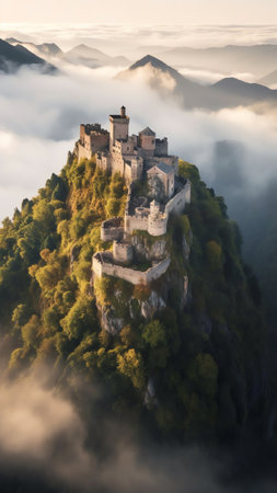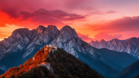 The ancient castle stands proudly on a hilltop, surrounded by vibrant autumn foliage, with golden sunlight casting shadows over the mountains and valleys below.