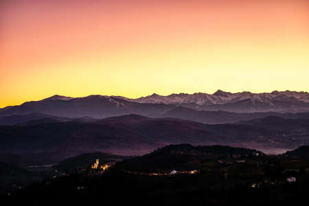 splendid sunset behind the Monviso mountain range, in Piedmont. in the foreground the valley of the Piedmontese Langhe
