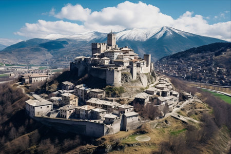 Generative AI : Aerial view of the castle on the hill in Castiglione della Pescaia a small town along the Mediterranean coastline in Grosseto province Tuscany Italy