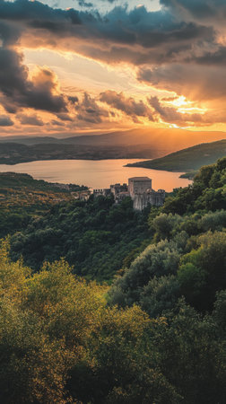 As the sun sets, Castel Gandolfo overlooks serene Lake Albano, enveloped by lush hills and a dramatic sky, capturing the essence of Lazio's beauty.