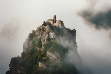 The majestic castle stands proudly on a rocky outcrop, blanketed in snow, as mist envelops the surrounding mountains on a serene winter day.