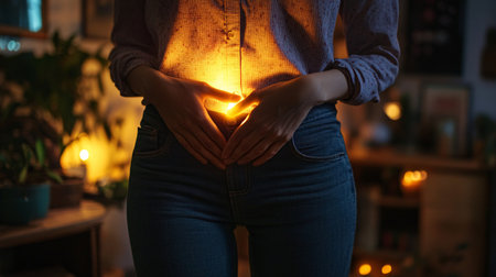 Young sick woman with hands holding pressing her crotch lower abdomen. Medical or gynecological problems, healthcare concept