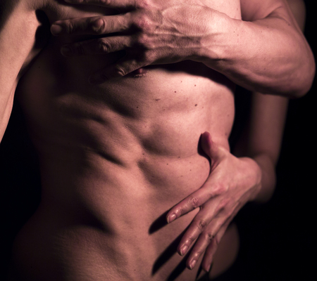 Sexy couple nude slim athletic man and erotic slender lady naked touching bodies in the dark.
