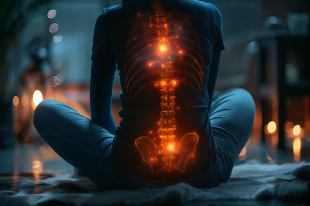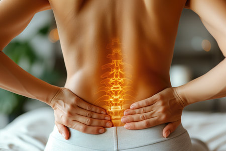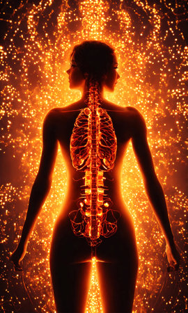 Back view of woman with spine pain, glowing orange vertebrae, indoor, health focus