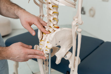Doctor man pointing on coccyx of human skeleton anatomical model. Physiotherapist explaining joints model. Chiropractor or osteopath points to the skeleton of human body. Bones anatomy close up