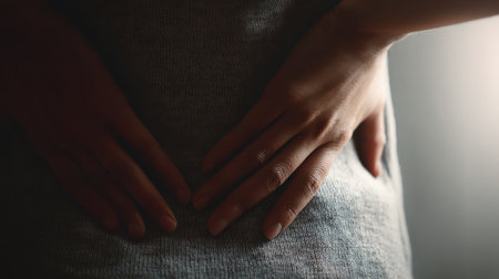 Soft light illuminates a pair of hands gently pressed against the lower spine, conveying a sense of calm and emotional support. The clean symmetry highlights a serene gesture.