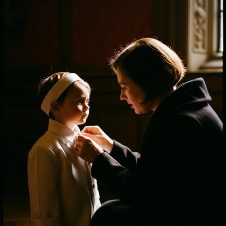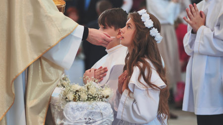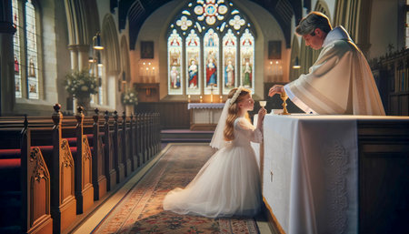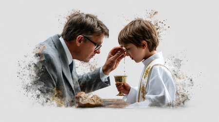 Sacred milestone: capturing the essence of first communion in a tender and symbolic portrayal, where young believers embrace the solemnity and spirituality of this significant rite.