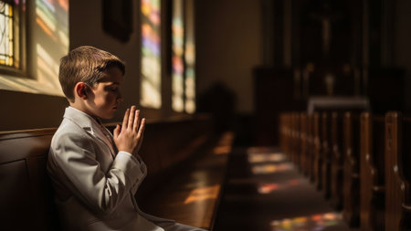 Boy in white suit praying in church pew, sunlit