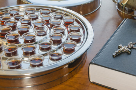Man holding bread and wine in Hoy Communion or Eucharist. Holy bible on table at the background.