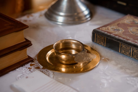 The priest holds church utensil, glans,ceremony of water baptism, various objects needed for baptism christening at Burgas